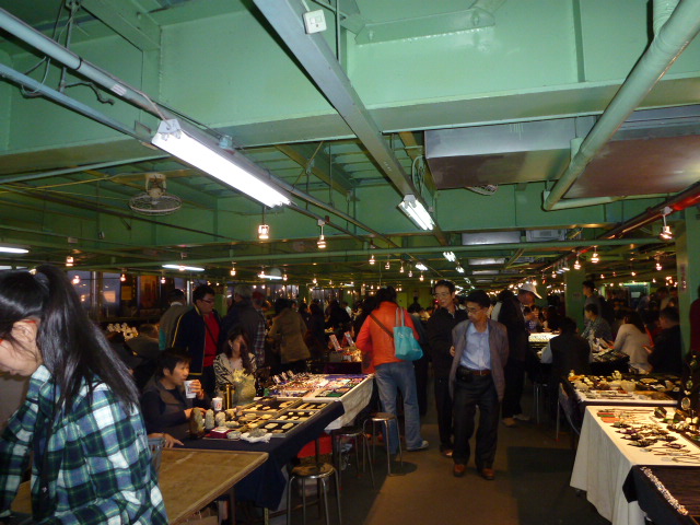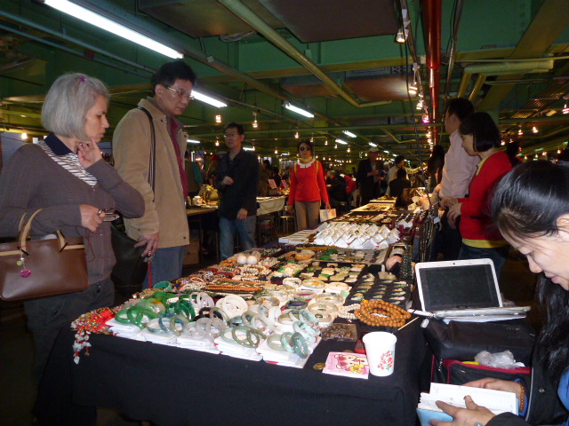 年代物から今風に細工されたもの、大陸産、台湾産などがそれぞれに美しさを競い、色もまた緑、茶、黄、赤と変化に富んでいた。天井は低く、ライトもそれほど強くない中、訪れた人たちは台と台の間の狭い通路に肩をぶつけ合いながら行き来して気に入った玉を探す。